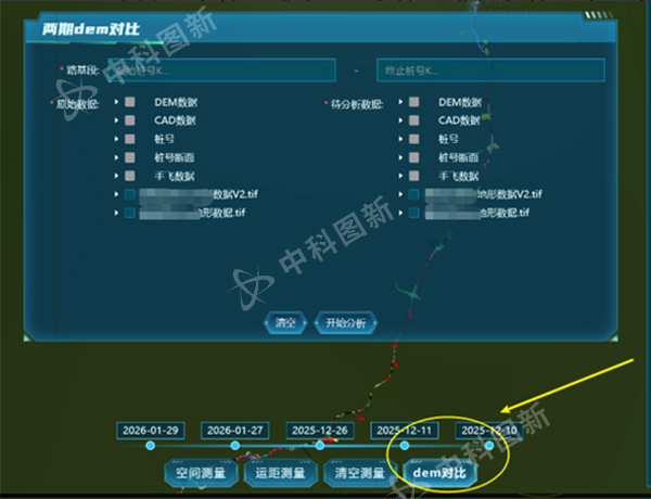 - 多时段数据管理:支持选择任意两个时间点的无人机航测地形数据(如“3月1日”与“4月1日”),自动匹配同一区域的数字表面模型,生成对比任务。