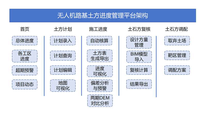 平台通过整合大疆机场自动化巡检能力与土方计算技术,构建高速公路路基土方施工的全流程进度管理体系。平台以“自动化”为核心,聚焦土方工程量的动态核算、计划与实际进度的偏差分析及施工过程的可视化管控,解决传统土方管理中数据滞后、核算精度低、人工复核难等痛点,实现从“经验管理”向“数据管理”的转型。