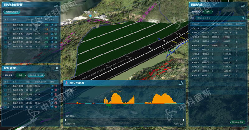 - 三维土方调配:支持导入设计阶段的土方调配方案(如挖填方量、取弃土场、运距),在GIS地图上绘制计划施工区域,关联BIM模型中的土方工程量数据,形成“计划-模型-区域”三位一体的土方调配视图。