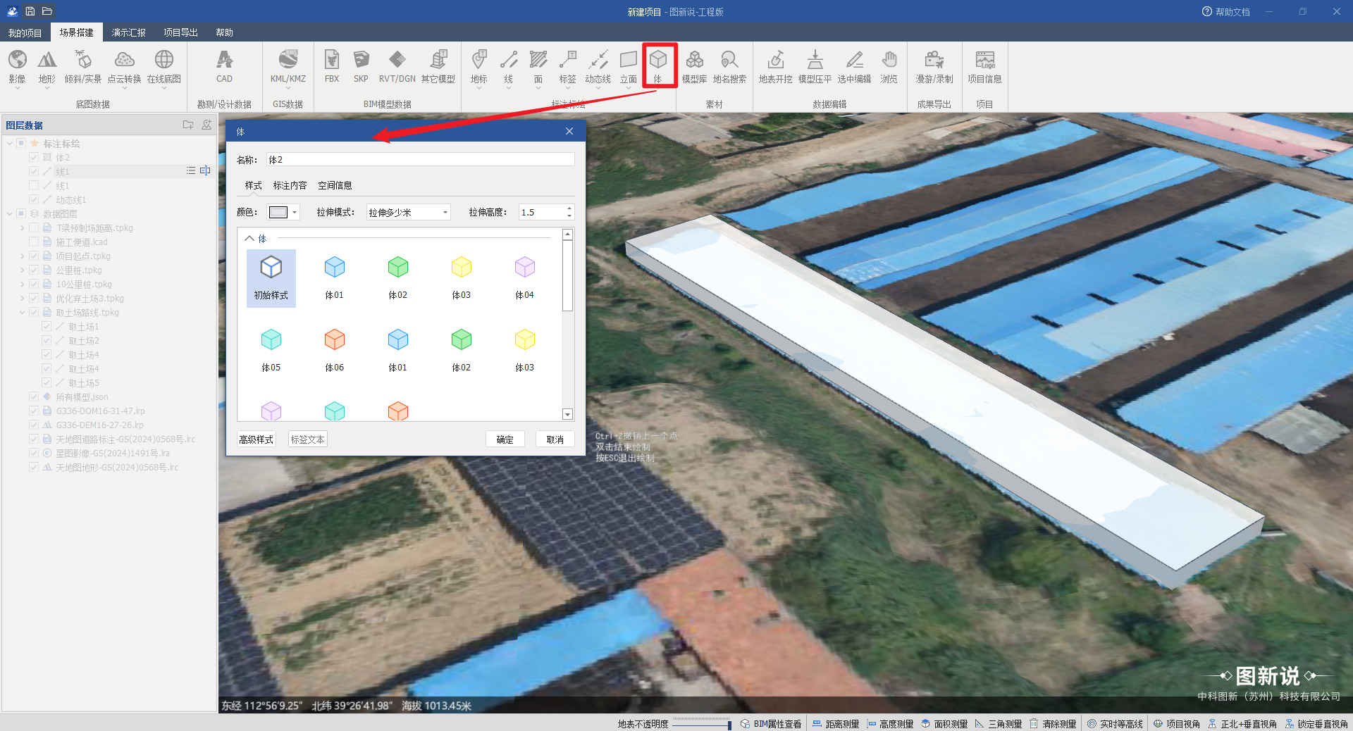 体是通过绘制至少三个节点,构成的一个立体要素,主要是用于在地图上添加一个垂直于地面的体,等同于画一个面向上进行拉伸。例如:临时厂房、临时板房、楼房、保安亭等,快速进行带有贴图的绘制。