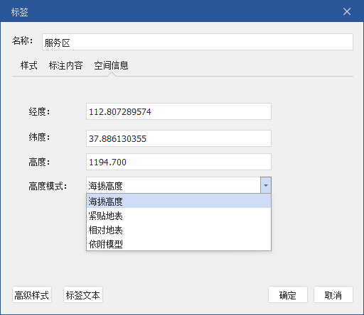 空间信息:可修改标签经纬度、高度信息,标签的高度模式,高度模式默认为海拔高度;