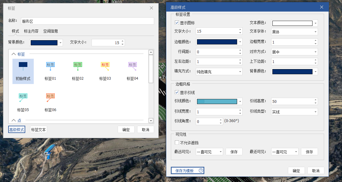 样式:包括标签背景颜色、文字大小等;更细节的样式(引线角度、标签图片背景填充等)调整,需要点击“高级样式”进行设置;