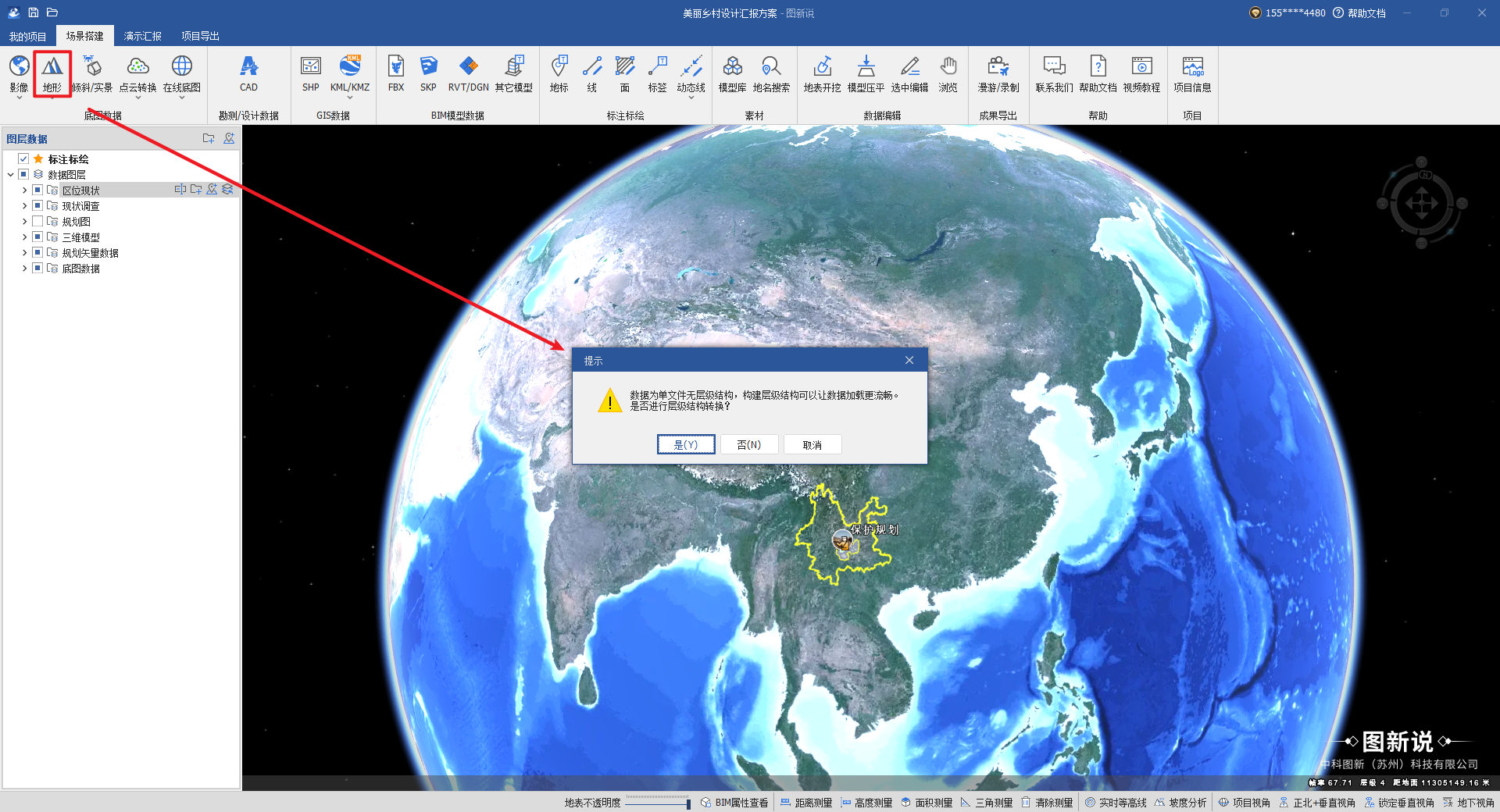 当数据量很大时,软件会提示“数据为单文件无层级结构,构建层级结构可以让数据加载更流畅。是否进行层级结构转换?”,建议点击“是”进行转换加载,提高数据浏览流畅度。点击“否”,将加载原始数据格式,不进行转换,可能会造成帧率降低、场景卡顿。