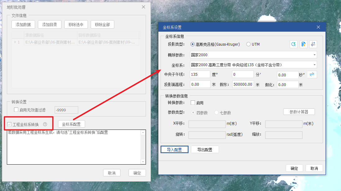 (5)工程坐标系转换:默认不勾选,勾选后,进行坐标系配置,配置完成后对列表中所有数据生效。(一般地形生成时会配置投影,如果制作时未选择投影信息,无投影的地形可通过配置工程坐标系加载到图新说)