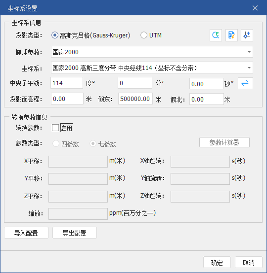 如果已知数据的工程坐标系,可以勾选“工程坐标系转换”进行配置坐标系、四七参等信息。