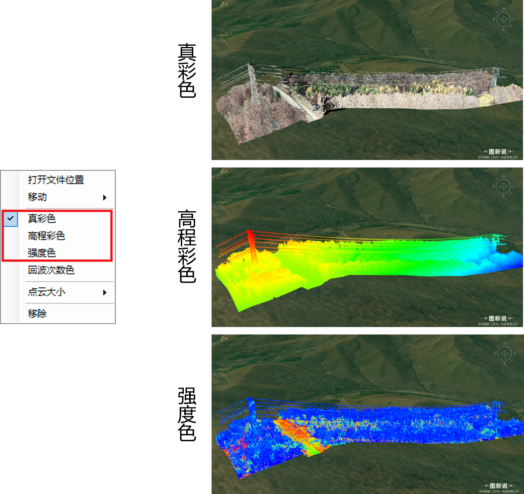 图新说支持las格式的点云数据加载到场景中进行展示,并且支持调整点的大小和色彩模式(真彩色、高程彩色、强度色、回波次数色)。