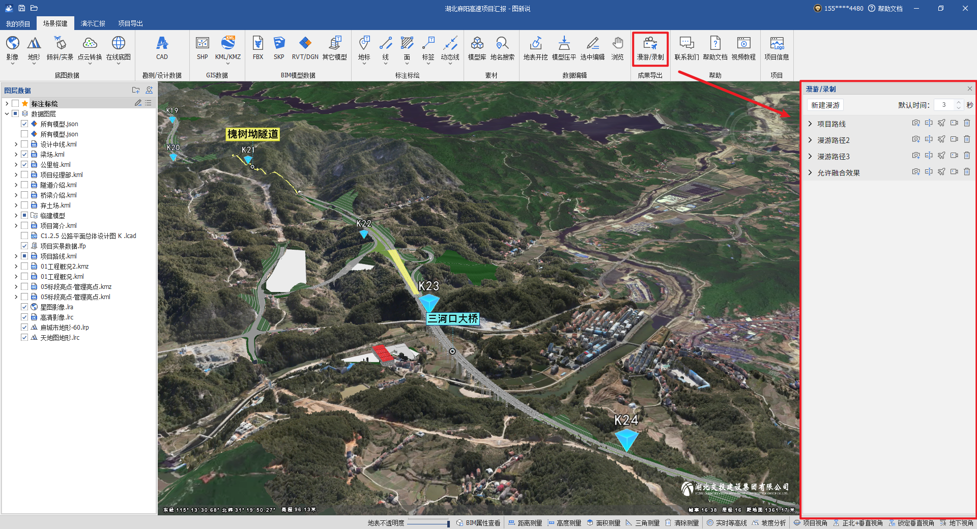 1、打开已经制作好的项目数据,点击“漫游/录制”功能,右侧弹出漫游数据框。