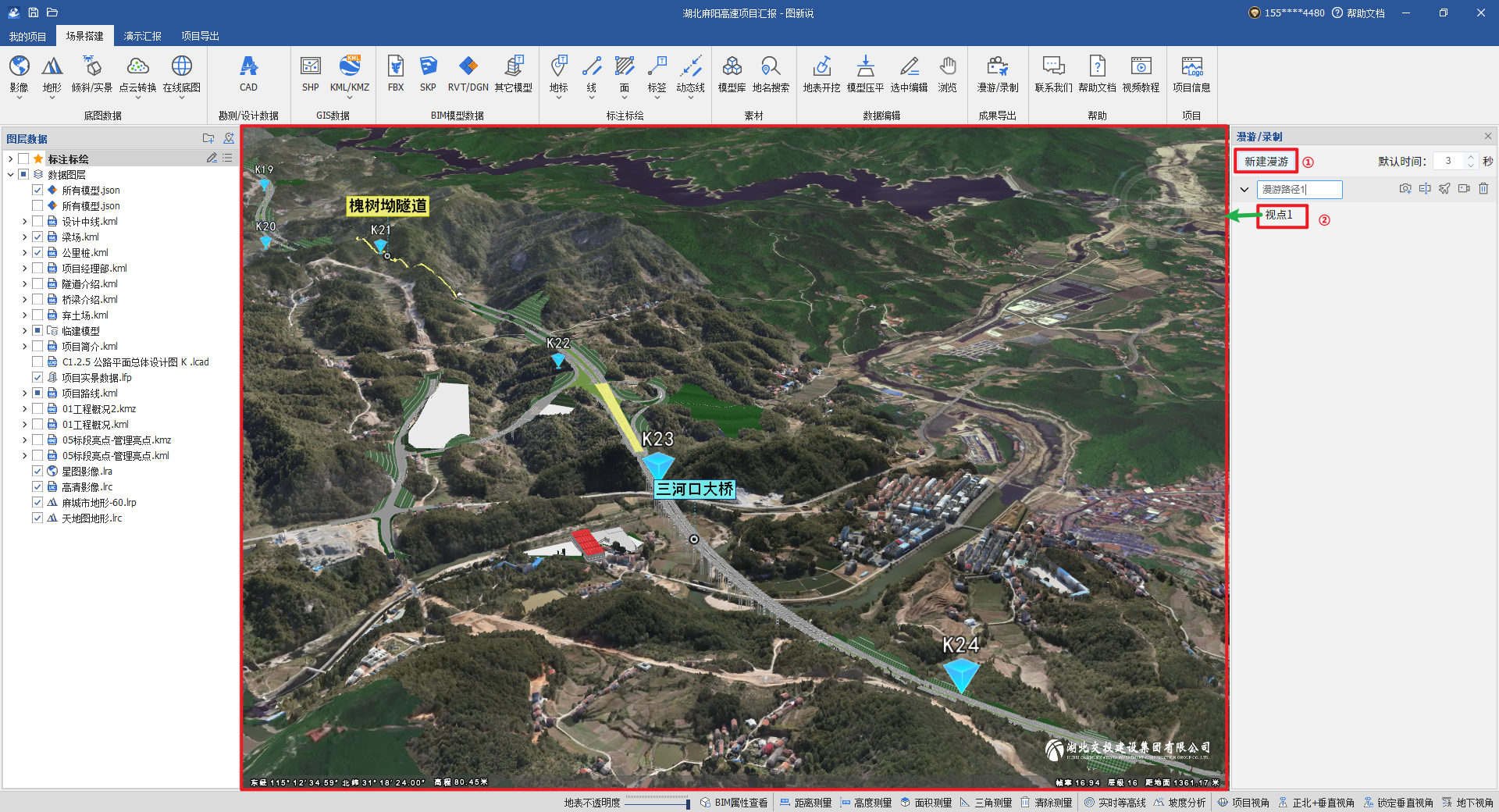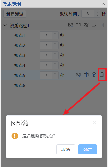 在右侧列表中双击某个视点,可以定位到视点位置进行查看,如果两个视点之间距离太远,可以调整飞行时长或者在场景中调整视角,点击“新建视点”插入视点。