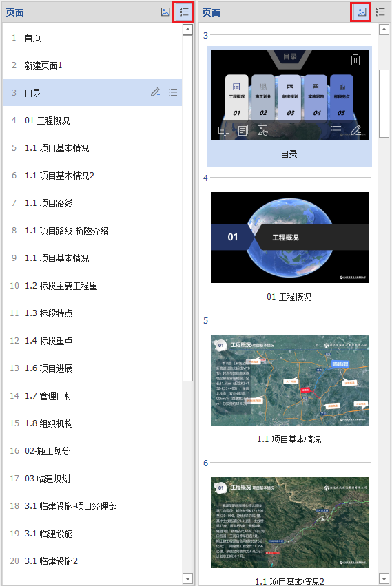 在演示汇报模块中,PPT页面列表有两种形式显示,一种是缩略图,另一种是目录列表,可以点击进行切换显示。
