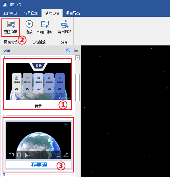 如果需要在已经创建好的两个页面之间插入一个新增一个页面,需要先在页面列表点击新增页面位置的前一个页面,再点击“新建页面”,就在选中的页面后面增加了一个页面。(例如下图,点击①位置的页面,再点击②新建页面,会在①后面新增一个页面③)