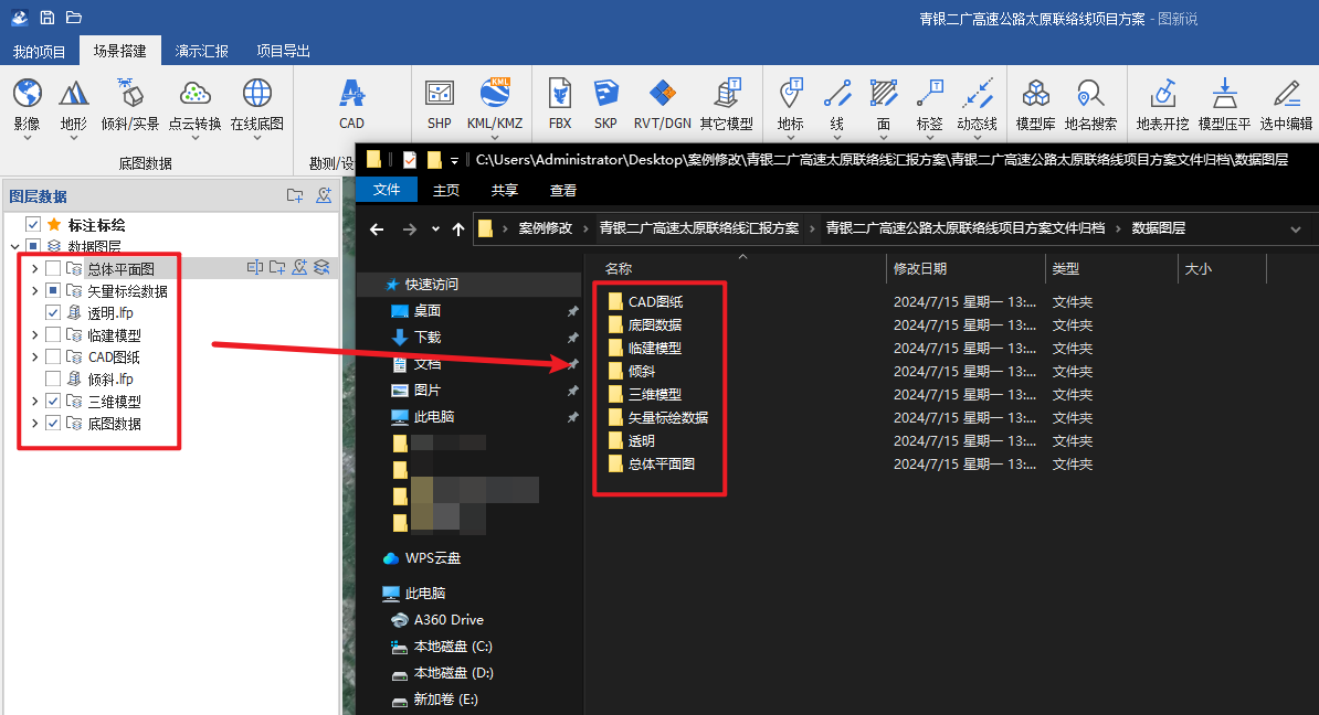 项目归档是指将图新说当前项目中加载的所有数据和工程进行归档到单个文件夹中,方便传递给他人或拷贝到其他设备上进行查看和编辑。
