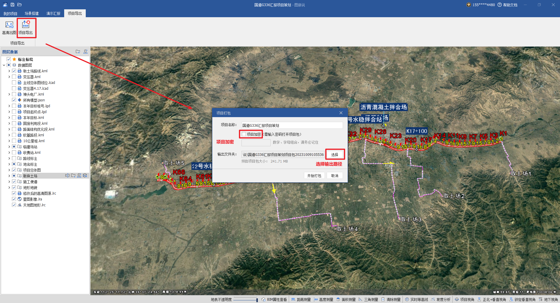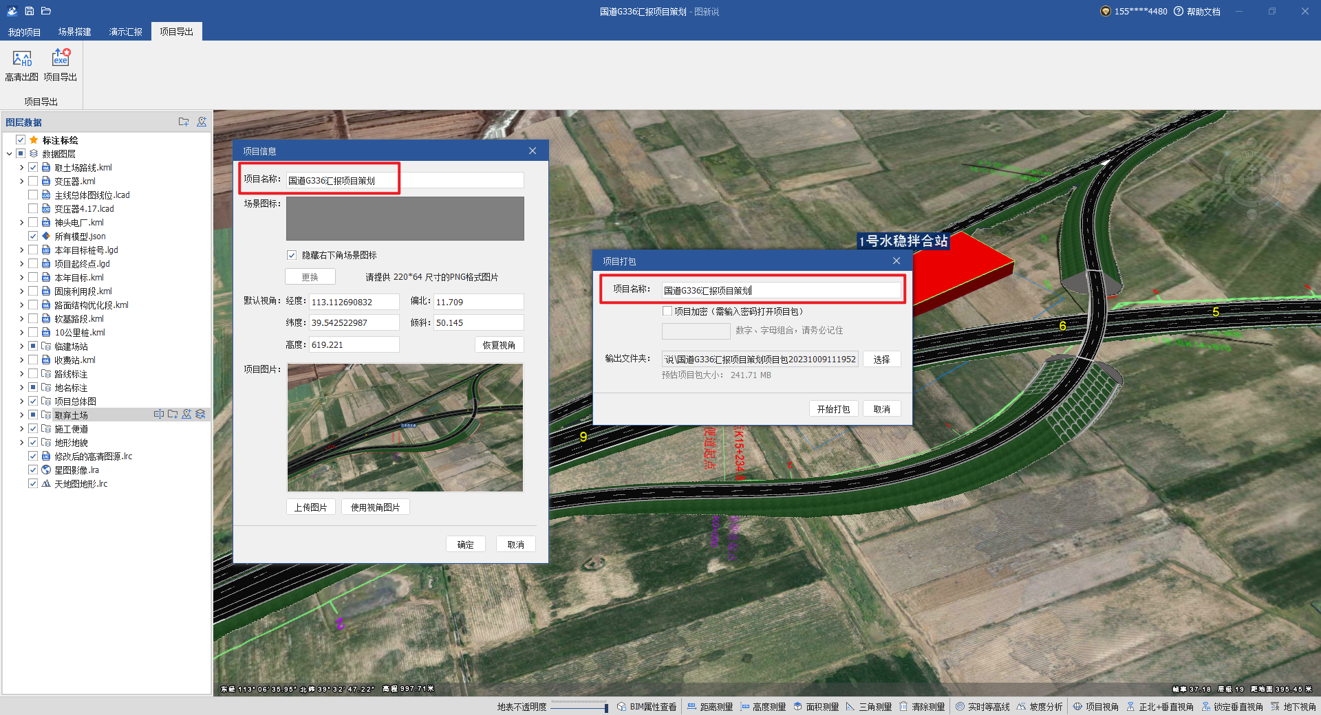 项目导出功能是指快速把各种测绘成果(正射影像、地形、倾斜模型、CAD设计数据、KML矢量标绘等)以及三维PPT汇报内容打包成一个exe软件,只需要双击即可直接查看三维电子沙盘。方便携带进行现场演示,还可用于项目方案交付等。